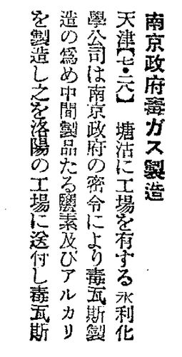 同盟旬報 第1巻 第04号(通号004号)P.0259 https://www2.i-repository.net/contents/myc/chosakai/A01_0104_004.pdf 南京政府、毒ガス製造 天津【7.28】塘沽に工場を有する水利化学公司は、南京政府の密命により毒ガス製造のため中間製品たる塩素およびアル…