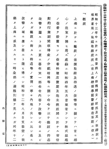 昭和十三年中における在留邦人の特種婦女の状況およびその取り締まりならびに租界当局の私娼取り締まり状況(在上海総領事館警察署沿革誌による) 一、芸妓 上海における芸妓の保護·取締および待遇の改善等に関しては、常に細心の注意を払ひをれるところ、さ…
