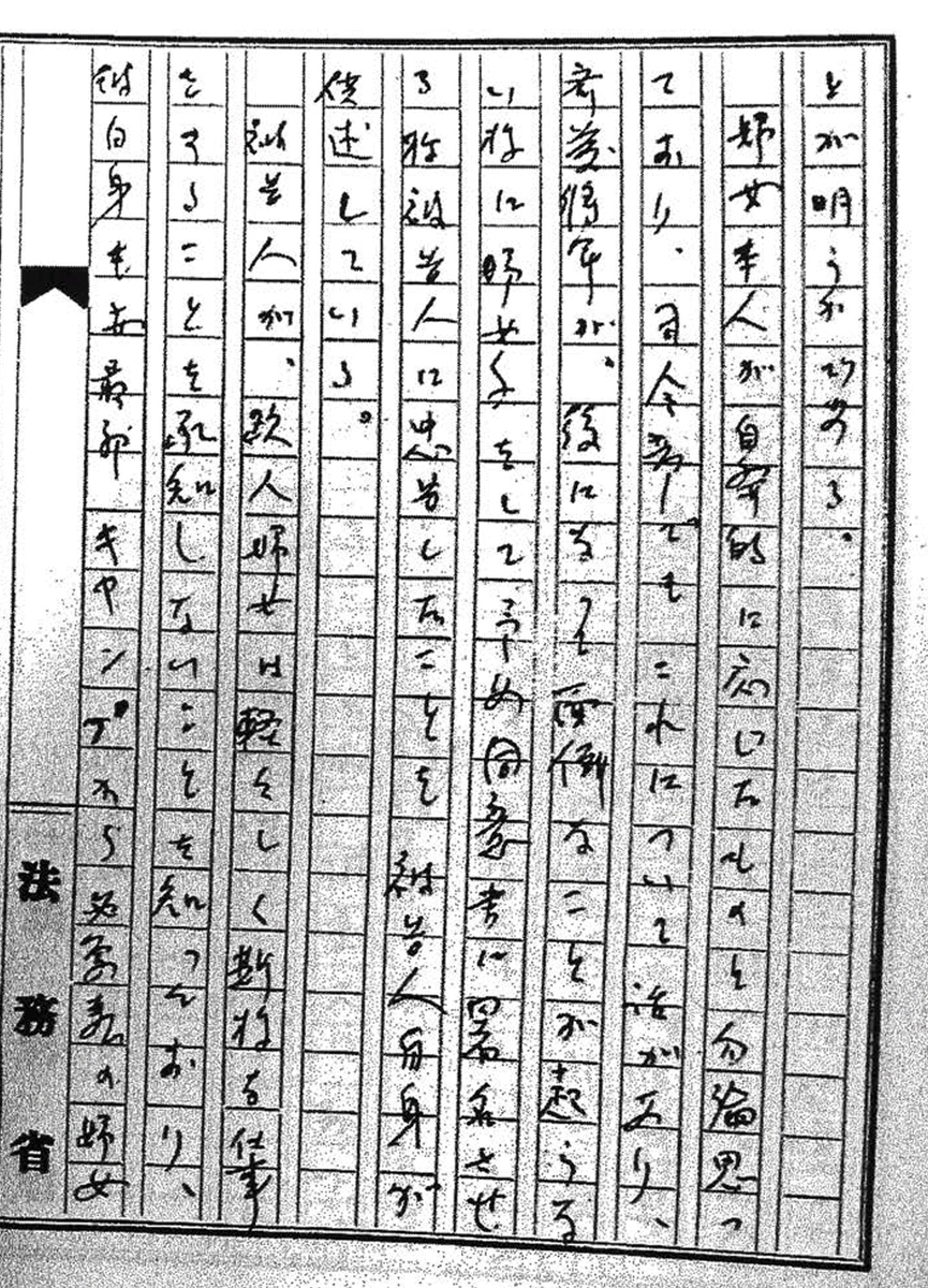 斯る目的の為に、収容されている婦女子を懲[ママ]発することは許すべからざることであり、特に斯る事情の下にあっては、真の自発的とゆうことはあり得ないことを見抜いているので、良俗の国際通念に反すると見られていることを考慮し、
