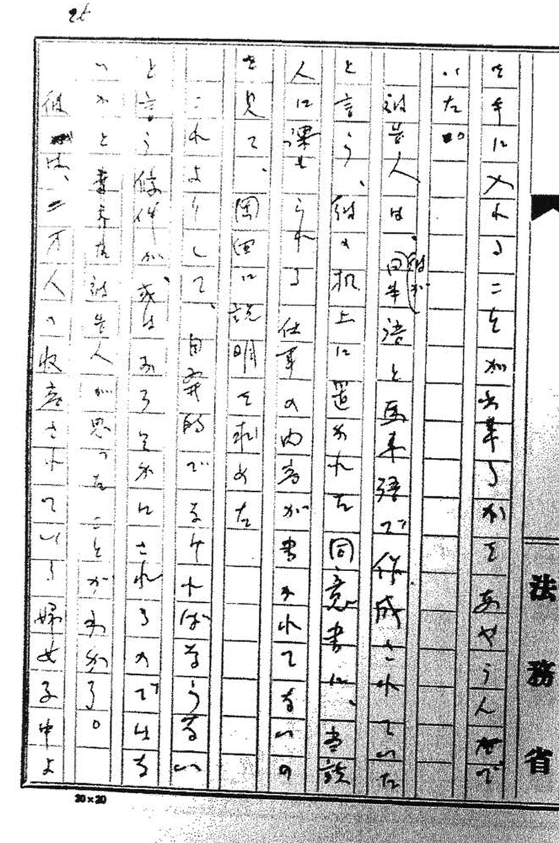 被告人は、彼が日本語と馬来語で作成されていたと言う、彼の机上に置かれた同意書に、当該人に課せられる仕事の内容が書かれていないのを見て、岡田に説明を求めた