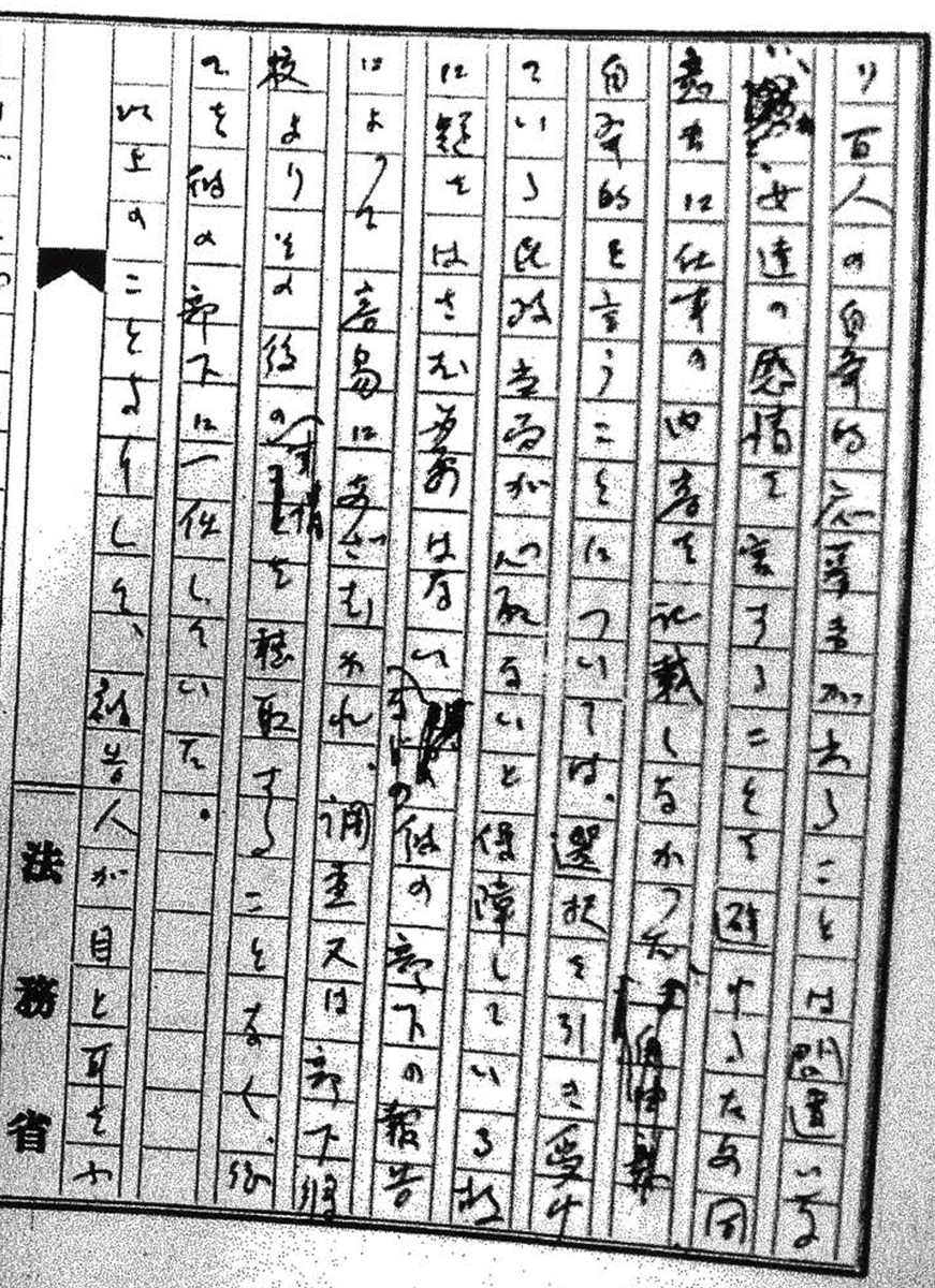 連れて来られた婦女子の或者が自己の意志に反して遊女屋に入れられたことに対し大に責任を感じておること、又遊女屋の閉鎖命令を彼の管理下にあった幹部候補生学校の将校団の□上□身上に印された汚点として受け取り、その為にバタビアに遺憾の意を表しに行ったこと、被告人が、监督すべきであったこと、そしてそれをしていたならば、彼の部下が行った出鱈目な行為がすぐ分ったに相違ないことを認