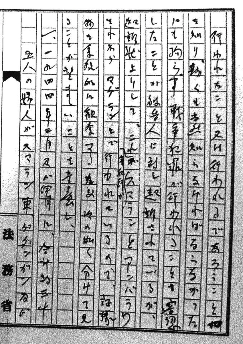 斯る事実は一九四六年法令広報㐧四十五号戰爭犯罪刑法㐧四條及以下に規定せられて処罰することが出来ることになっている。